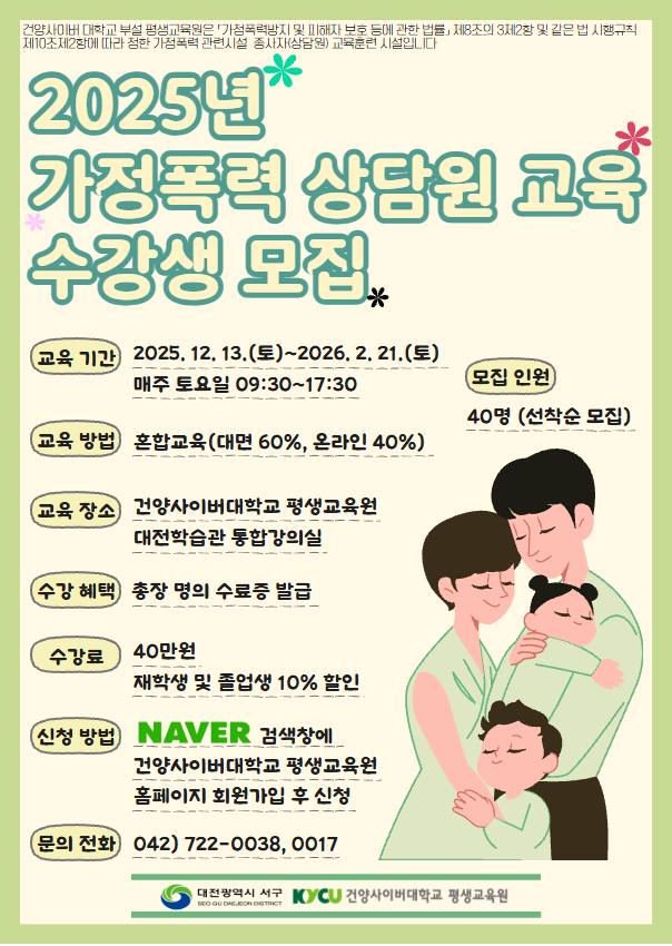 | 2025년 가정폭력 상담원 양성교육 모집 | 최고관리자 / 2025.11.18 | |